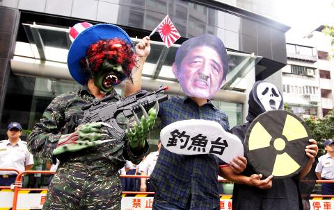 Separately yesterday, several dozens of people set a model paper Izumo-class ship on fire in protest against Japan’s claim to sovereignty over the contested Diaoyutai Islands (釣魚台), known as the Senkakus in Japan, outside the building of the Interchange Association, Japan, in Taipei.