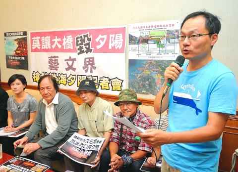 Artists and writers yesterday called for the protection of the famous sunset at Tamsui River’s (淡水河) mouth as a piece of cultural heritage, while they protested against a planned bridge construction project.