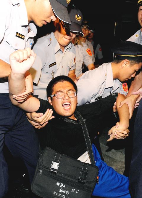 “[Premier] Jiang Yi-huah [江宜樺] come out! Take up your responsibility!” dozens of protesters shouted outside the Executive Yuan at about 9:30pm on Wednesday.