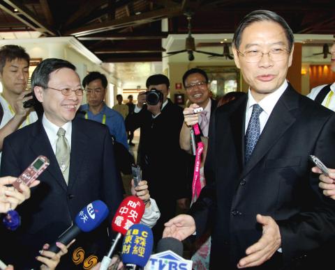 Wang and his Chinese counterpart, Taiwan Affairs Office Director Zhang Zhijun (張志軍), spoke briefly in the lobby of Hotel Laguna in Bali, Indonesia, addressing each other by their official titles.