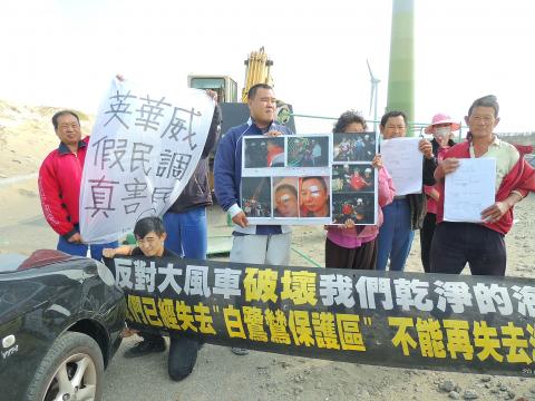 Activists against a wind turbine construction project in Miaoli County’s Yuanli Township (苑裡) yesterday criticized wind energy firm InfraVest over violent acts by security guards during a protest by local residents at the construction site.