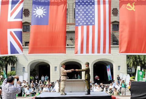 Pro-localization groups and academics in Taipei yesterday staged a re-enactment of Japan’s surrender in 1945 with the raising of a “Taiwan flag” to rebut the Chinese Nationalist Party’s (KMT) long-held claims that it “liberated” Taiwan on Retrocession Day on Oct. 25, 1945.