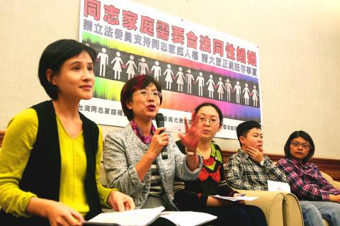 Democratic Progressive Party legislators Cheng Li-chun (鄭麗君) and Yu Mei-nu (尤美女), the two lawmakers who proposed to legalize same-sex marriage in the legislature, were also present at the press conference to show their support.