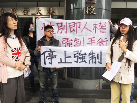 Holding a giant banner that read: “Gender is a right, stop forced gender reassignment surgery,” gender rights activists rallied outside the conference in New Taipei City’s (新北市) Sindian District (新店), which was organized by the Ministry of Health and Welfare.
