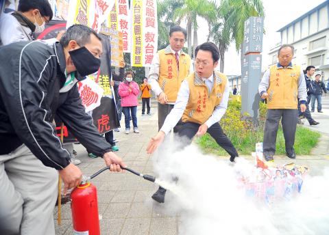 Holding signs that read “kick Chen Deming out,” a group of protesters, led by the Taiwan Solidarity Union’s (TSU) Greater Tainan City chapter director Chen Chang-hui (陳昌輝), staged a rally outside Taiwan Semiconductor Manufacturing Co’s plant in the Tainan Science Park as Chen and his delegation took part in a tour of the facility.