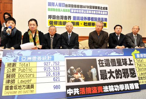 A petition initiated by Doctors Against Forced Organ Harvesting to stop the practice in China has garnered more than 230,000 signatures in Taiwan, lawmakers and activists said on Human Rights Day yesterday.