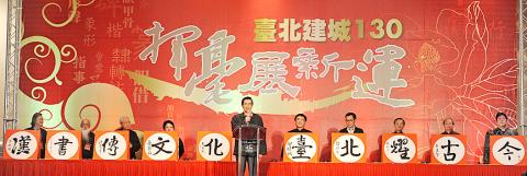 Ma joined Taipei Mayor Hau Lung-bin (郝龍斌) and calligraphy masters to write down Chinese characters by creating calligraphy to welcome the new year, while insisting that the government would not promote simplified Chinese characters because of the increasing number of Chinese tourists.