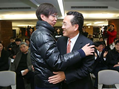 Former death row inmates Su Chien-ho (蘇建和) and Chuang Lin-hsun (莊林勳) yesterday appeared at a press conference to support lawyer Wellington Koo (顧立雄), who is seeking the Democratic Progressive Party’s (DPP) nomination as its candidate for the year-end Taipei mayoral election.