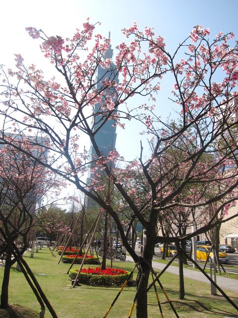 With the approach of cherry blossom season in Taiwan, buds on the cherry trees at Songzhi Park in Xinyi District (信義) have begun to open, revelaing their pink petals. Located near two of the city’s main tourist attractions, Taipei 101 and the Eslite Xinyi Store, the park is one of the new locales for cherry blossom viewing in urban areas, with 12 Taiwan cherry trees lining the park, which is surrounded by high-rise office buildings.