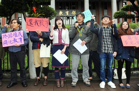 A group of Aborigines yesterday protested in front of the Ministry of Education (MOE) building in Taipei, calling for an end to what the protesters called colonial assimilation education and deploring the China-centered and Han-centered history perspective instilled by the Republic of China (ROC) government since its arrival in Taiwan in 1949.