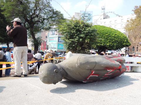 At about 1pm during a gathering of more than 100 members of the advocacy group, about 20 people wrapped ropes around the bronze likeness and dragged it to the ground in less than one minute.
