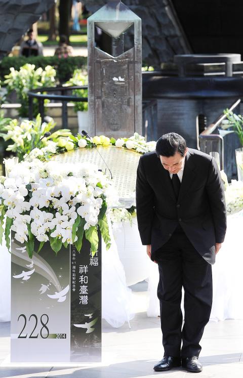 Ma, accompanied by Taipei Mayor Hau Lung-bin (郝龍斌) and government officials, led guests at the ceremony in a moment of silence in honor of the people killed in the 228 Incident.
