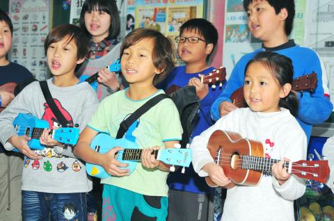 Bebin added ukulele lessons to the school curriculum in 2010 and the instrument quickly became popular among the children as it is portable, affordable and easy to learn, said Lin Chia-jung (林佳蓉), one of the school’s ukulele instructors.