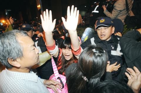 Hundreds of protesters began to storm into the Executive Yuan compound on Sunday evening in an attempt to take over the building — apparently following the model of another group of protesters, led by Chen and National Taiwan University graduate student Lin Fei-fan (林飛帆), who have occupied the Legislative Yuan since Tuesday last week.