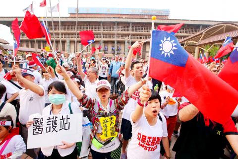 “We want to see the controversy dealt with via the representative system instead of street protests. If the students think the system is flawed, they should resort to deliberative democratic mechanisms or popular referendums, not take to the streets as people did decades ago,” said Sun Chien-ping (孫健萍), convener of the White Civil Justice League, which initiated the anti-occupation protest.