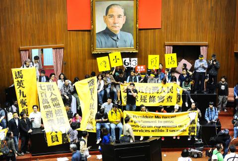 Hundreds of people — also mainly students — who supported the occupation gathered outside the legislative compound. The protesters’ demands included Premier Jiang Yi-huah’s (江宜樺) resignation, an apology from President Ma Ying-jeou (馬英九) and a return of the service trade pact to an item-by-item review by the legislative committees.