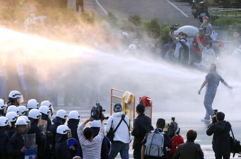 In the evening, hundreds of protesters broke into the Executive Yuan compound, which is about 200m from the Legislative Yuan.