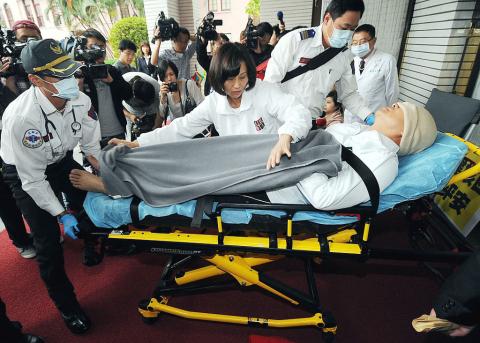 Meanwhile, DPP Legislator Chen Ou-po (陳歐珀), who accompanied former DPP chairman Lin I-hsiung (林義雄) on his hunger strike and mute protest on Tuesday, passed out yesterday morning due to low blood sugar levels and high blood pressure.