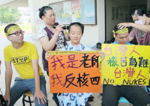 GIGE associate professor Yang Chia-ling (楊佳羚) also joined in yesterday, saying that her seven-year-old daughter supported her decision and even offered to draw an antinuclear emblem on the back of her head.