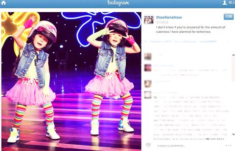 A scene of Taiwanese twin sisters “Zony” (左左) and “Yony” (右右) dancing to a Korean pop song that was broadcast on television in the US on Thursday showed the children getting a standing ovation from the audience on The Ellen DeGeneres Show.