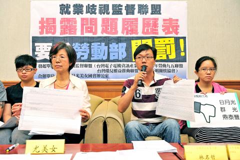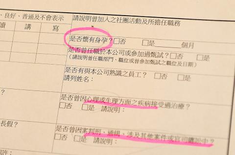 Accompanied by Democratic Progressive Party Legislator Yu Mei-nu (尤美女), activists held a news conference at the legislature in Taipei yesterday, accusing companies of discriminating against applicants based on their answers.
