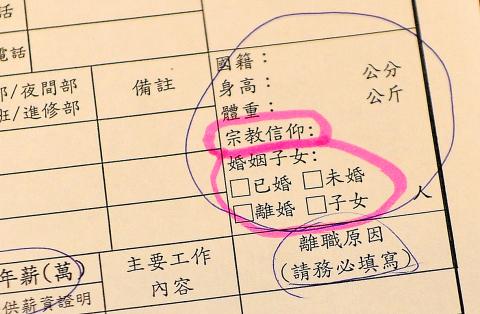 An official with the Ministry of Labor, Wang Ya-fen (王雅芬), said that asking irrelevant questions on a job application could be discrimination and in violation of the law.