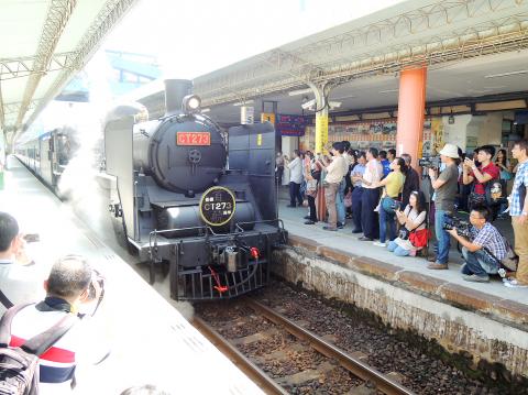 A CT273-model steam locomotive, which had not seen active duty for 35 years carried passengers again yesterday as part of celebrations of the 127th anniversary of the founding of the precursor to the Taiwan Railways Administration (TRA).