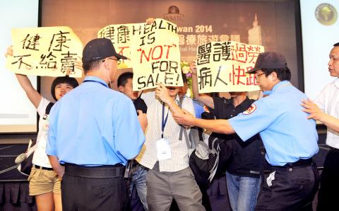 Dozens of representatives from the Doctors’ Working Conditions Reform Task Force, the Taiwan Radical Nurses Union, the Taiwan Healthcare Reform Foundation, Covenants Watch, the Taiwan Association for Victims of Occupational Injuries and the Black Island National Youth Front staged a protest outside the Taipei International Convention Center, where the Asia segment of the annual World Medical Tourism and Global Healthcare Congress was being held.