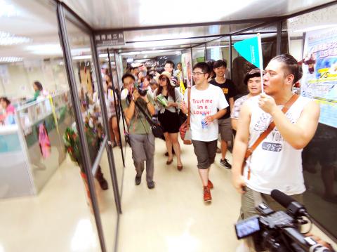 Aboriginal activists yesterday organized a “tour group” to visit the Tourism Bureau headquarters in Taipei to protest the agency’s proposal to encourage Chinese tourists attend Ilisin festivals and other traditional events held in Amis Aboriginal communities along the east coast.