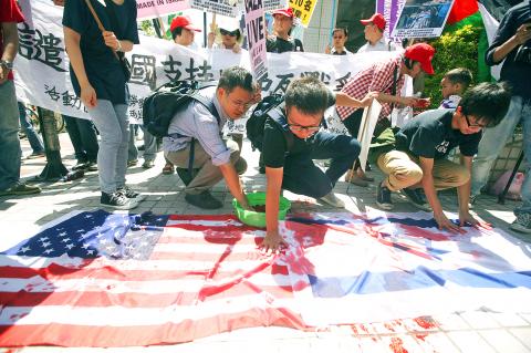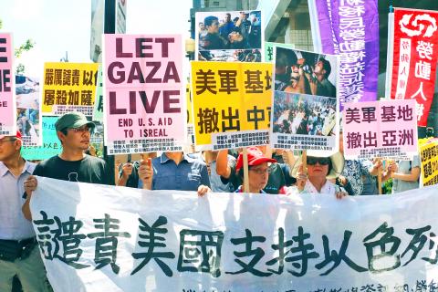 Dozens of protesters yesterday demonstrated outside the Taipei office of the American Institute in Taiwan (AIT) against US support for Israel in the recent conflict between Israel and Hamas that has led to heavy civilian casualties in the Gaza Strip.