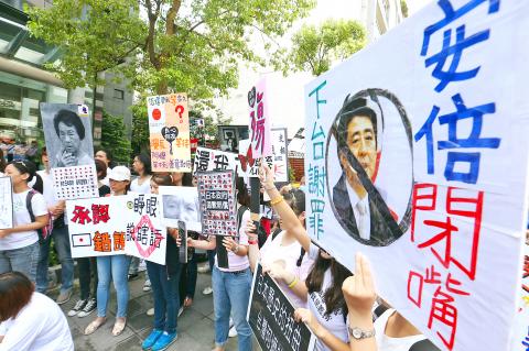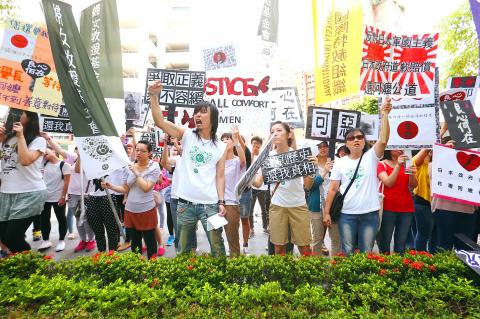 On the eve of the 69th anniversary of Japan’s surrender in World War II, dozens of rights advocates yesterday demonstrated outside the Japanese representative office in Taipei, calling on Tokyo to formally apologize for forcing hundreds of thousands of women and girls to serve in military brothels during the war and to compensate them.