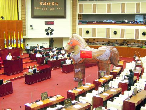 DPP City Councilor Wang Shih-chien (王世堅) had earlier added flourish to his accusations by bringing in a 3.5m-high “Trojan Horse” prop imprinted with the flag of the People’s Republic of China (PRC) during a question-and-answer session at the Taipei City Council on Monday.