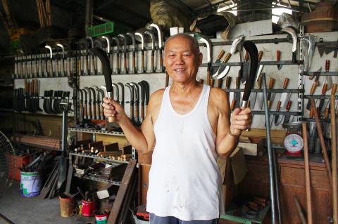 One of the last metalsmiths in Greater Kaohsiung’s Cishan District (旗山), Chifeng Smithy Shop owner Lin Chi-kuang (林吉光), is feeling the pinch that automated production has put on handcrafted goods from stores like his.