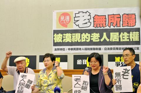 Democratic Progressive Party Legislator Chen Chieh-ju (陳節如), who accompanied the groups in the press conference, urged the government to address the housing needs of senior citizens, as Taiwan is an aging society.