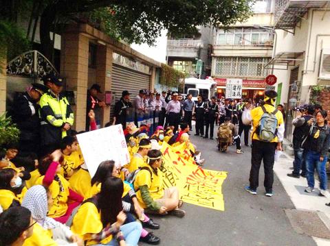 Hsu Ren-yuan (徐任遠), the organization’s secretary and a National Taiwan University student, said the group decided to demonstrate in front of the premier’s home after failing to see him two weeks ago when they occupied the lobby of the Ministry of Labor.