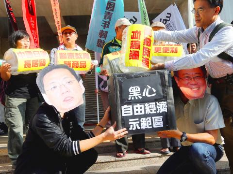 A draft bill governing the establishment of free economic pilot zones has provoked resistance from opposition politicians and activists, with a coalition of civic groups protesting outside the Legislative Yuan in Taipei yesterday as the bill went under evaluation at the legislature’s Economics Committee.