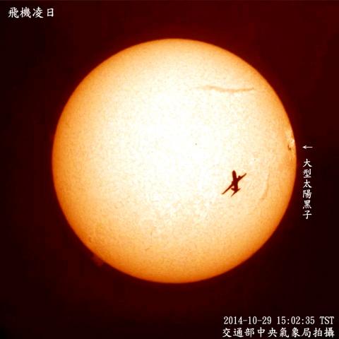 The Central Weather Bureau yesterday displayed an unusual photograph captured while it was observing sunspots on Oct. 29, which shows a Boeing 737 aircraft flying across the solar disk.