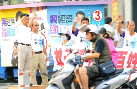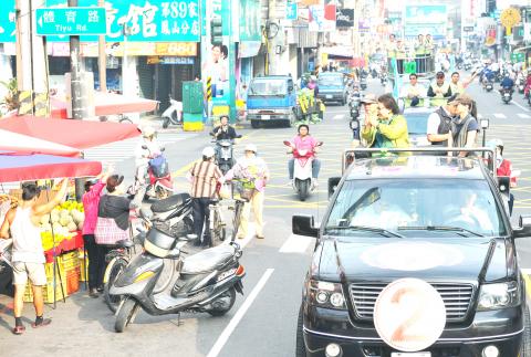 Chen’s Chinese Nationalist Party (KMT) opponent, Yang Chiu-hsing (楊秋興), also started canvassing for votes yesterday, standing on the intersection of Boai 1st Road and Dashun Road and waving to passing motorists. Many passers-by responded by waving back, flashing their lights or honking their horns.