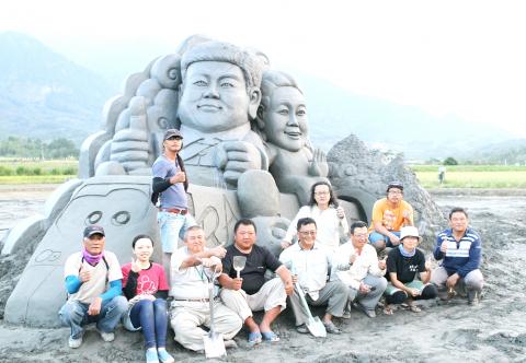 Earlier this month, the Fuli Township Farmer’s Association commissioned sand carving artist Yeh Kun-ting (葉坤定) to create the piece, which was nearing completion yesterday.