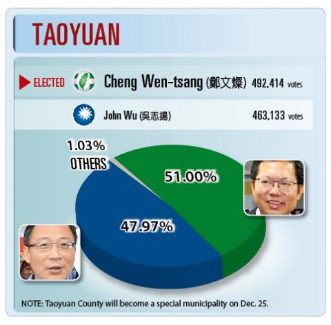 Taoyuan County Commissioner John Wu (吳志揚) of the Chinese Nationalist Pary (KMT) lost his re-election bid to Democratic Progressive Party (DPP) challenger Cheng Wen-tsan (鄭文燦), after failing to cross the 50 percent threshold in the nine-in-one elections yesterday.