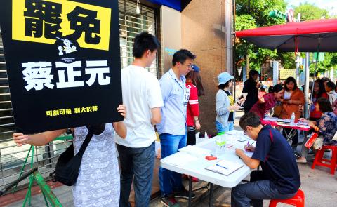 A spokesperson for the project, known as “Mr Lin from Taipei” (台北林先生), said that by midday, the 18 stalls in Taipei’s Neihu (內湖) and Nangang (南港) districts — which are Tsai’s constituencies — had collected at least 15,000 signatures, and extra volunteers had been called in to help cope with the demand.