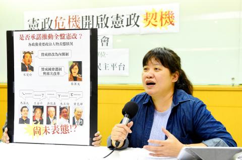 Chen Chao-ju (陳昭如), another NTU law professor, said that 2016 — the year of presidential and legislative elections — would be a good time to conduct a referendum to amend the Constitution.