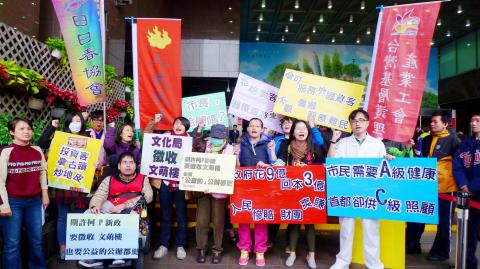 Separately, the People Are The Boss group and the Taiwan Radical Nurses Union staged a demonstration in front of the hall, urging Ko and city officials to make known their stance on the Taipei Wellness Clinic and Resort project.