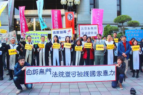 Led by attorney Wellington Koo (顧立雄) and the Judicial Reform Foundation, a coalition of more than 20 activist groups accused the judiciary of “protecting state violence” and “trampling on human rights.”