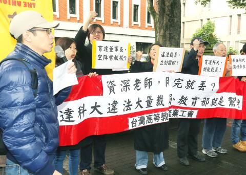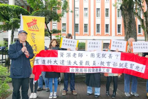 Representatives of the Taiwan Higher Education Union yesterday gathered outside the Ministry of Education in Taipei to protest what they termed the lack of due process in college instructor layoffs.
