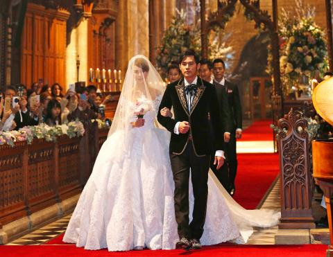 Mando-pop king Jay Chou (周杰倫) and Taiwanese-Australian model/actress Hannah Quinlivan (昆凌) were married in Yorkshire, England, on Saturday afternoon in an extravagant ceremony featuring a string ensemble playing a composition by Chou.