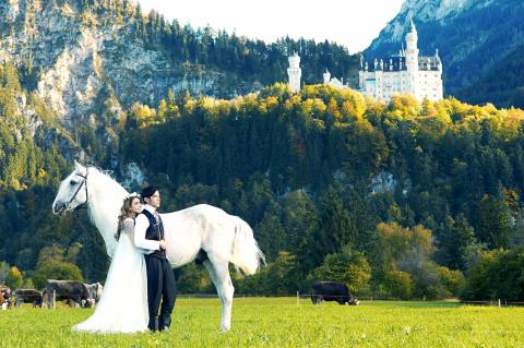 Another shows Quinlivan in a long white dress embracing Chou, who is wearing a white shirt and dark vest and pants, next to a horse in a pasture, with the iconic Bavarian castle of Neuschwanstein in the background.