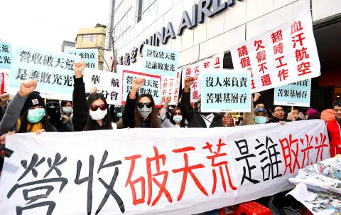 The protesters said that China Airlines plans to give its employees a flat year-end bonus of NT$20,000 (US$633) and raises of 2.5 percent, refuting the company’s claims that its employees received NT$45,000 each in year-end bonuses — which the employees said included funds from their own pockets that went to employee benefit committees.
