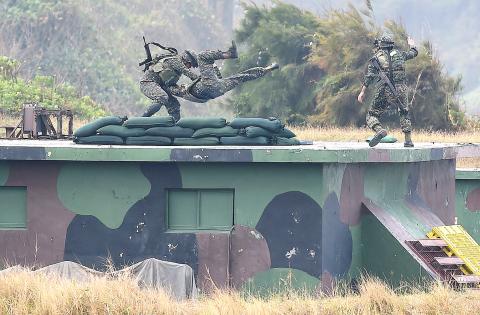 A live-fire drill simulated a PLA surprise attack and seizure of the harbor, where a 30-man unit hid in a Chinese cargo ship entering Kaohsiung port to dock.