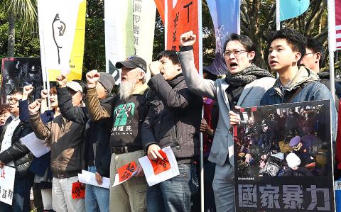 Members of dozens of civic groups and about a dozen of the 119 people this week indicted for their activities during the Sunflower movement protests yesterday demonstrated outside the Executive Yuan against the prosecutors’ decision.